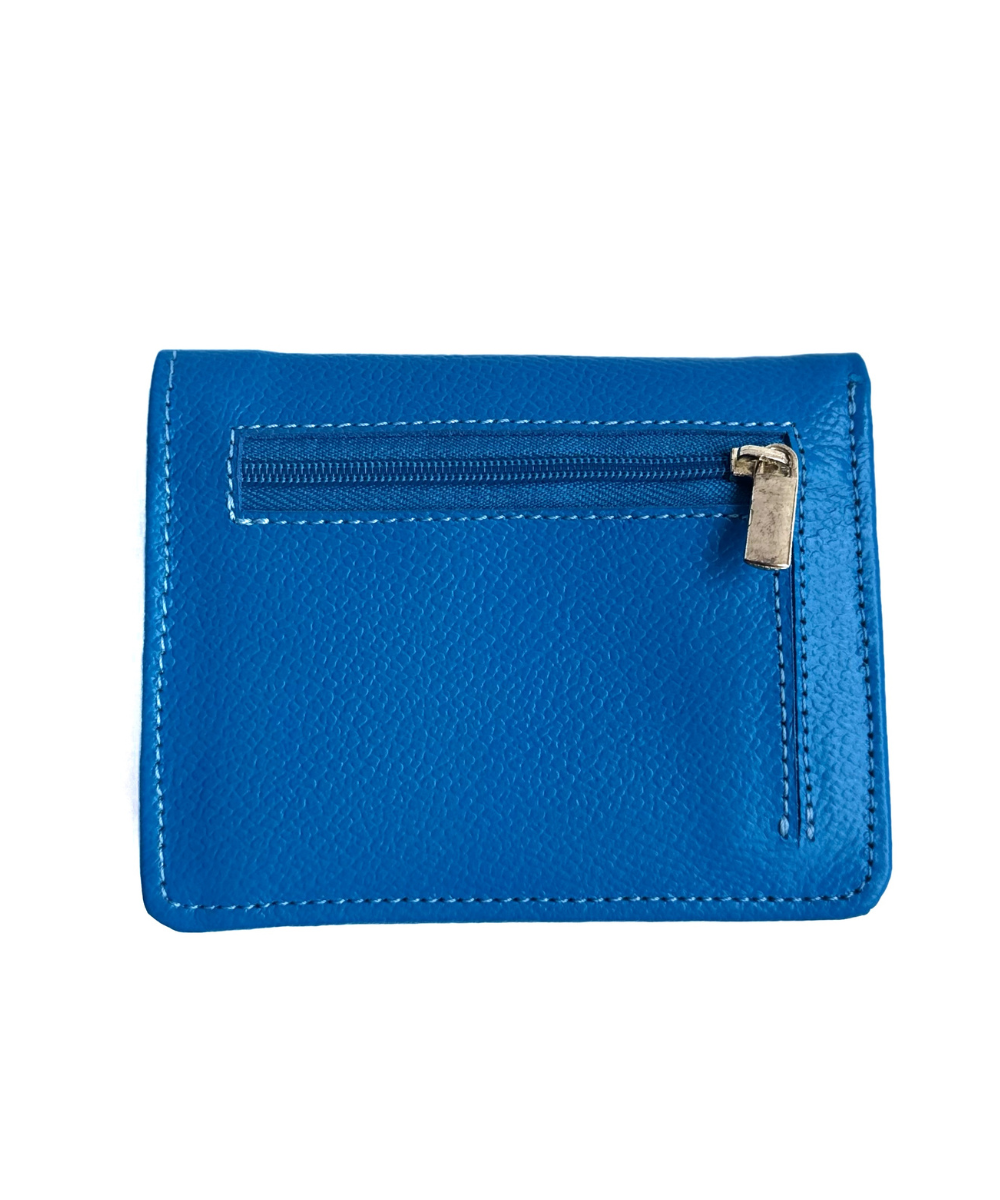 Nuestra Billetera para mujer en cuero azul cobalto, se encuentra equipada para que lleves tus documentos, dinero y monedas de manera seguira y chick ademas de ser eco amigable, utilizando retal de cuero.